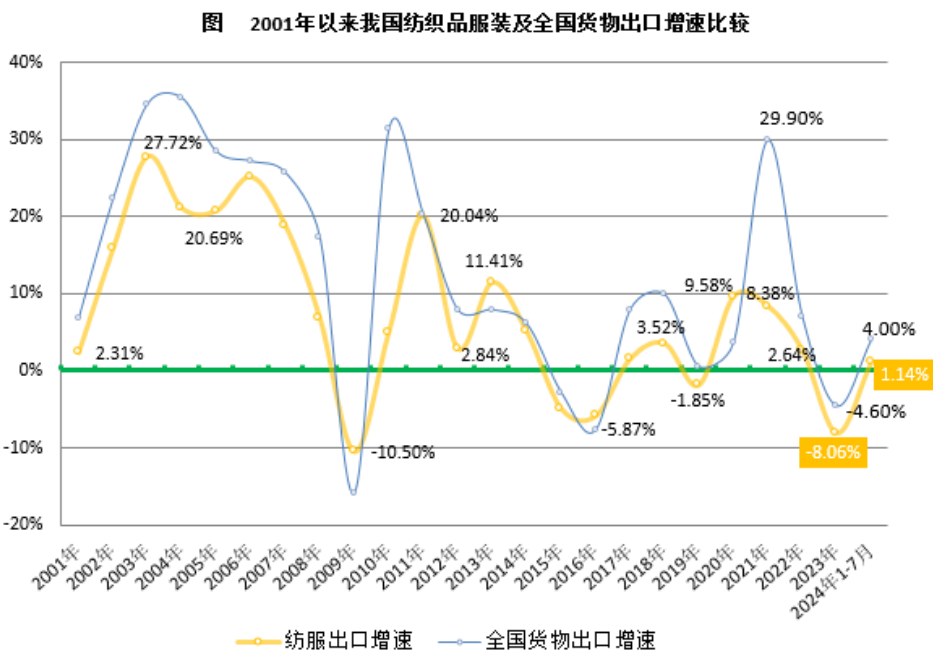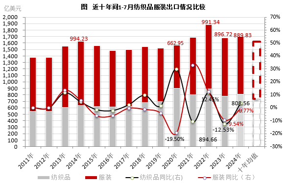 海关总署8月7日发布的最新数据显示,7月纺织服装出口在基数较低的情况下出现超预期下降。按美元计,当月纺织服装出口额268亿美元,同比由正转负,下降0.5%。出口负增长主要受服装出口下降拖累,服装当月出口同比下降3.6%,纺织品出口同比增长4%。初步分析,服装出口下降的主要原因是出口价格下跌迅速。二季度,服装出口价格整体下跌了9.3%,下跌趋势进一步延续到三季度。1-7月,纺织服装累计出口同比增长1.1%,其中纺织品出口增长3.3%,服装出口下降0.8%。