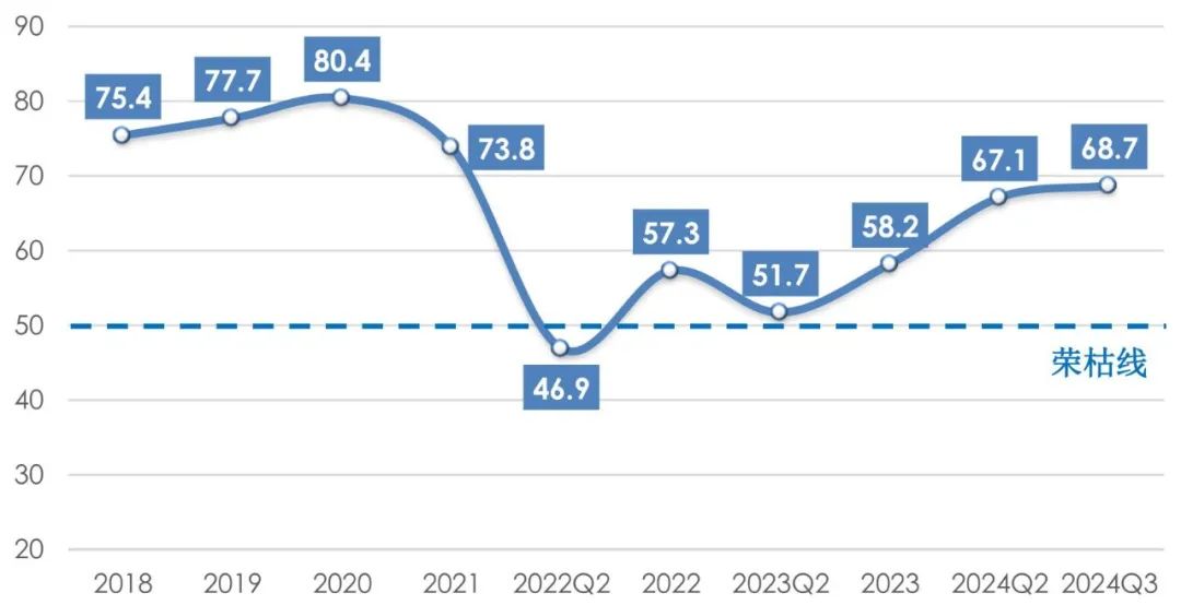 2024年前三季度,全球经济增长势头强劲,但通货膨胀压力、贸易紧张局势和投资环境趋紧等问题依然存在;我国经济运行总体稳中有进,高质量发展扎实推进,向好因素累积增多。我国产业用纺织品行业经济运行呈恢复性增长态势,市场需求持续复苏,行业出口整体处于回暖区间。根据协会调研,2024年前三季度我国产业用纺织品行业景气指数为68.7,较上半年提升1.6个百分点(图1)。