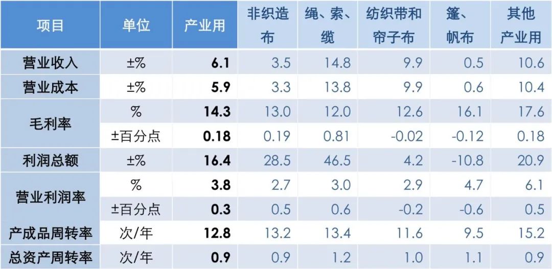 根据国家统计局数据,2024年前三季度产业用纺织品行业规模以上企业的营业收入和利润总额分别同比增长6.1%和16.4%;根据中国产业用纺织品行业协会测算,行业规模以上企业的营业利润率为3.8%,同比提高0.3个百分点;行业亏损面为23.6%,较上半年收窄1.6个百分点。2024年以来,在低基数效应、国内外市场需求复苏等因素叠加影响下,行业主要经济效益指标持续回升向好,但仍面临原材料价格波动、需求支撑不足、市场竞争激烈等挑战。分领域看,1-9月非织造布规模以上企业的营业收入和利润总额分别同比增长3.5%和28.5%,营业利润率为2.7%,同比提高0.5个百分点;绳、索、缆规模以上企业的营业收入和利润总额分别同比增长14.8%和46.5%,增速均居行业首位,营业利润率为3%,同比增加0.6个百分点;纺织带、帘子布规模以上企业的营业收入和利润总额分别同比增长9.9%和4.2%,营业利润率为2.9%,同比降低0.2个百分点;篷、帆布规模以上企业的营业收入同比微增0.5%,利润总额同比下降10.8%,营业利润率为4.7%,同比下降0.6个百分点;过滤、土工用纺织品所在的其他产业用纺织品规模以上企业的营业收入和利润总额分别同比增长10.6%和20.9%,6.1%的营业利润率为行业最高水平(表1)。表1 2024年1-9月产业用纺织品行业运行主要经济指标(规模以上)