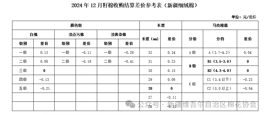 2024年12月《中国棉花协会籽棉收购结算差价参考表(新疆细绒棉)》正式发布