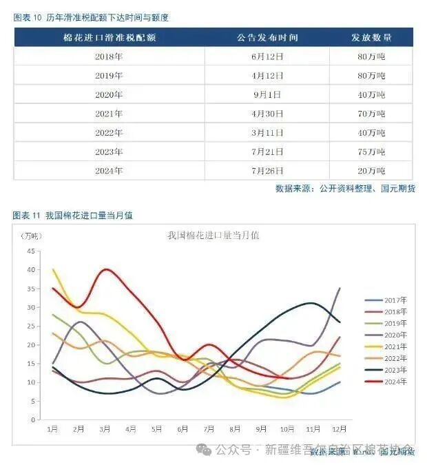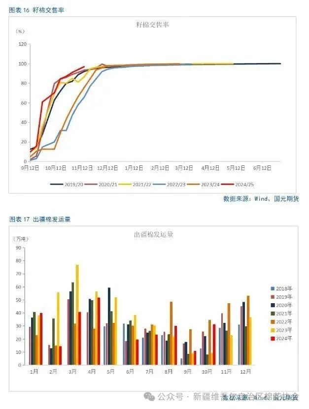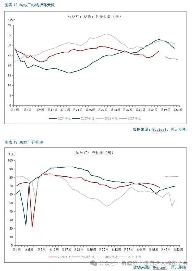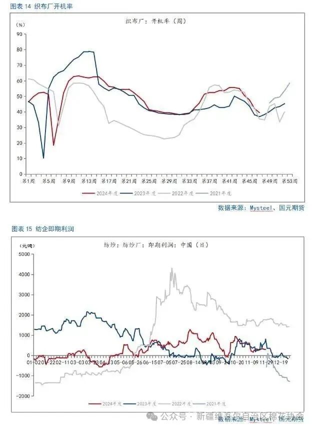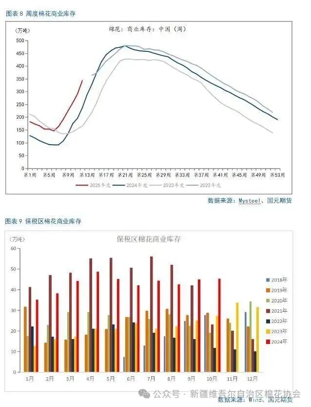 目前市场预计我国2024/25年度新棉产量有可能达到650万吨,供应端充足已成为市场交易的明牌。供应端的充足主要体现在以下三个方面。第一,皮棉累计加工量较2023年同期大幅增长。随着新棉收购量逐渐减少,停收的轧花厂增多,主要精力向皮棉加工转移,全国累计加工量接近400万吨,继续保持同期高位。中国棉花协会公布的全国棉花收购加工周报显示,截止2024年11月24日,全国皮棉累计加工量392.8万吨,同比增长22%。新疆地区皮棉累计加工总量386.7万吨,同比增长22.7%,其中,自治区皮棉加工量258.7万吨,同比增长30.7%;兵团皮棉加工量128.1万吨,同比增长9.3%。内地累计加工量为6.1万吨,同比下降13.4%。第二,我国棉花商业库存拐点出现较同期稍早且大幅增长。按产业逻辑,加工后的棉花进入商业环节,棉花商业库存由此开始增加。随着国内新棉集中上市,市场资源得到大量补充,且2024/25年度棉花产量增长叠加销售疲弱,2024年10月国内棉花商业库存环比同比均有较大幅度增长。截至10月18日当周,我国棉花商业库存已回升至163.62万吨,之前一周为146.3万吨,之前一周的棉花商业库存数值也为整个2024/2025年度的最低水平,由此发现,10月11日当周,为我国2024/25年度棉花商业库存的拐点,2023/24年度我国棉花商业库存的拐点为10月第三周,2022/23年度我国棉花商业库存的拐点为10月第二周。最新月度数据显示,截至2024年10月31日,我国棉花商业库存为288.7万吨,环比增加119.9万吨,明显高于2023年同期,同比增加48.2万吨,创4年同期最高水平。最新周度数据显示,截至2024年11月第三周,我国棉花商业库存为343.27万吨,环比增加51.88万吨,同比增加106.28万吨。第三,保税区棉花商业库存偏高。2024年我国棉花滑准税进口配额下达时间较晚、配额数量很少,导致保税区棉花商业库存居高不下,截至2024年10月底,我国保税区棉花商业库存数据为45.2万吨,不仅为年内的偏高水平,在近7个年度中也处于偏高水平。在保税区棉花商业库存难以消化的背景下,三季度末开始我国棉花进口量开始下降。我国2024年9月棉花进口量为11.73吨,环比减少21.84%,同比减少50.28%,创年内新低;2024年10月棉花进口量环比下降9.79%,同比下降63.26%,再创年内新低。