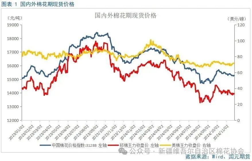 郑棉方面,首先在内在价值上,下方有籽棉收购价作为盘面支撑,上方有轧花厂套保盘压制近月合约的上涨空间;其次在国内供应端上,2024/25年度我国棉花产量较上年度同比小幅增加,皮棉加工量超2023/24年度同期,截至2024年11月底,我国皮棉加工进度超6成,同比增长22%,棉花商业库存创4个年度新高;再次在进口量上,我国2024年滑准税配额偏低,近期棉花进口量同环比下降明显,2024年10月棉花进口量环比下降9.79%,同比下降63.26%,再创2024年新低,按照季节性规律,预计2025年上半年我国棉花进口量仍将处于偏低水平,进口端上暂不对国内棉价造成进一步冲击。最后在下游需求上,下游淡季到来,纺企开机率刷新一年低点,后期应关注2024年的冬季备货情况。美棉方面,首先在估值上,目前美棉03合约所处的位置已经属于美棉历史上偏低估值区间;其次在基本面上,2024/25年度全球棉花主产国基本增产,供需偏宽松的状态有望持续至2025年一季度,虽然2024年11月的美国农业部全球棉花供需报告公布的2024/25年度全球棉花消费量同比增加,但后续美国农业部有可能会调降2024/25年度全球棉花消费预估值。一、2024年棉花期货市场行情回顾
