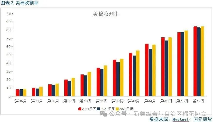 近期美国种植带大部分地区天气晴好,采收机械继续在田上作业,零星出现阵雨的产区田间工作和采收活动几乎没有中断,阿拉巴马州和乔治亚州降雨较大地区的收割遭遇延误。整体收割进度快于正常水平,阿肯色州、加利福尼亚州、路易斯安那州、密西西比州、密苏里州、田纳西州和弗吉尼亚州的收割工作已基本结束,持续关注主产区天气状况对收割工作的影响。美国农业部在每周作物生长报告中公布称,截至2024年11月24日当周,美国棉花收割率为84%,较之前一周提升7个百分点,快于2023年同期及五年平均水平。