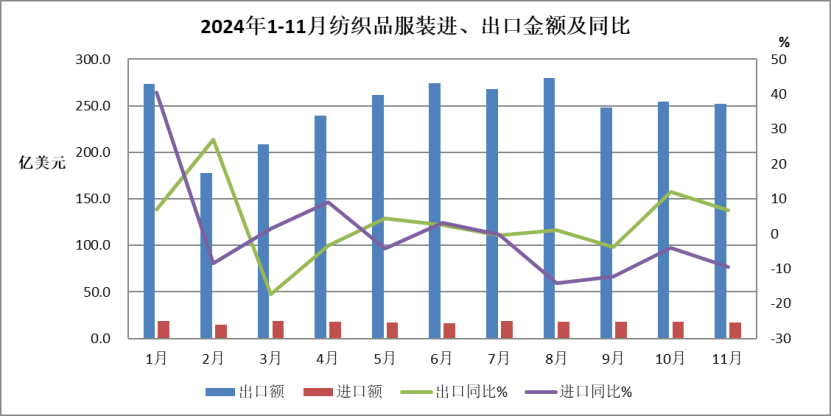 11月我国纺织服装出口继续保持增长,1-11月出口额达2730亿美元